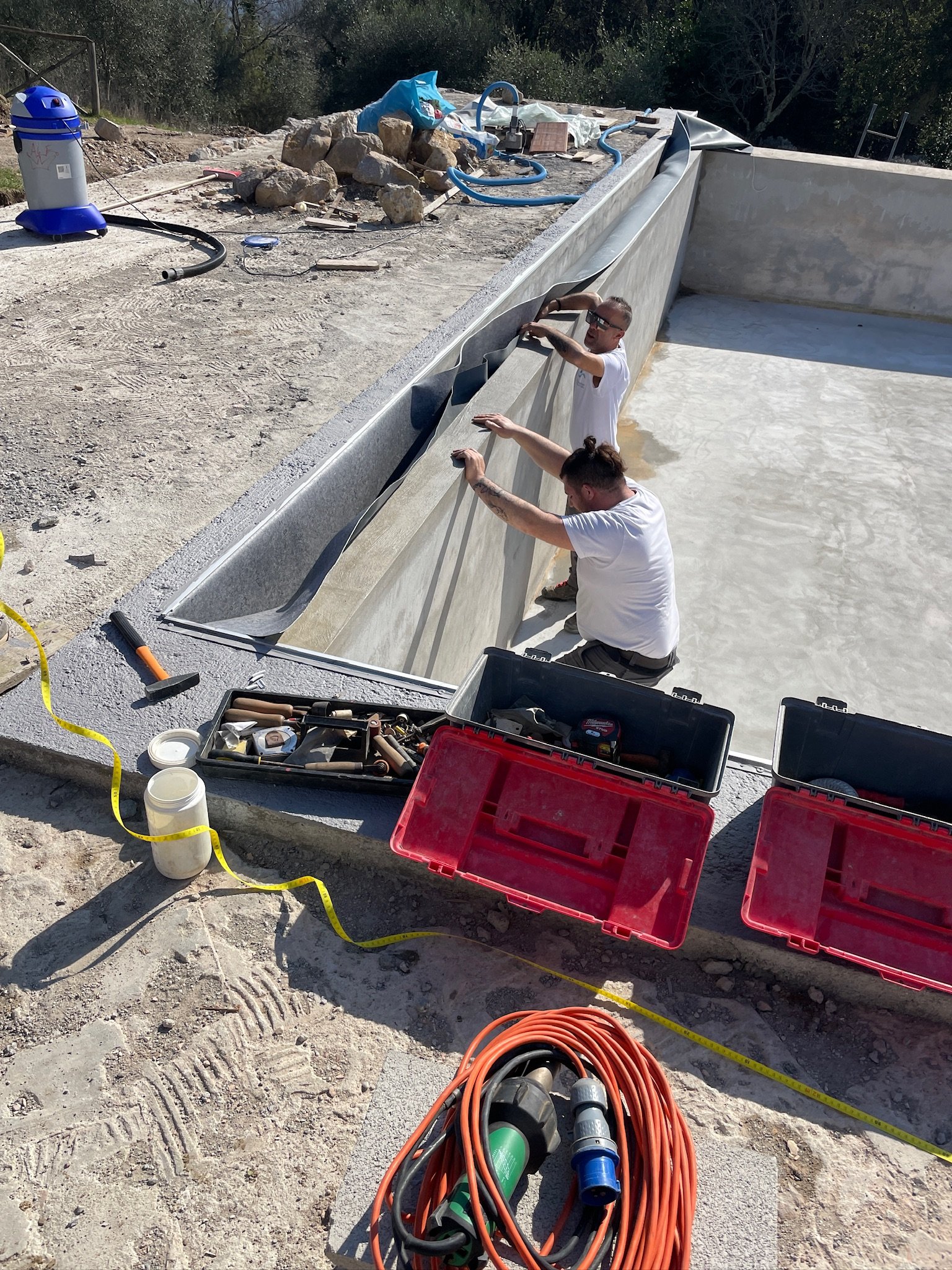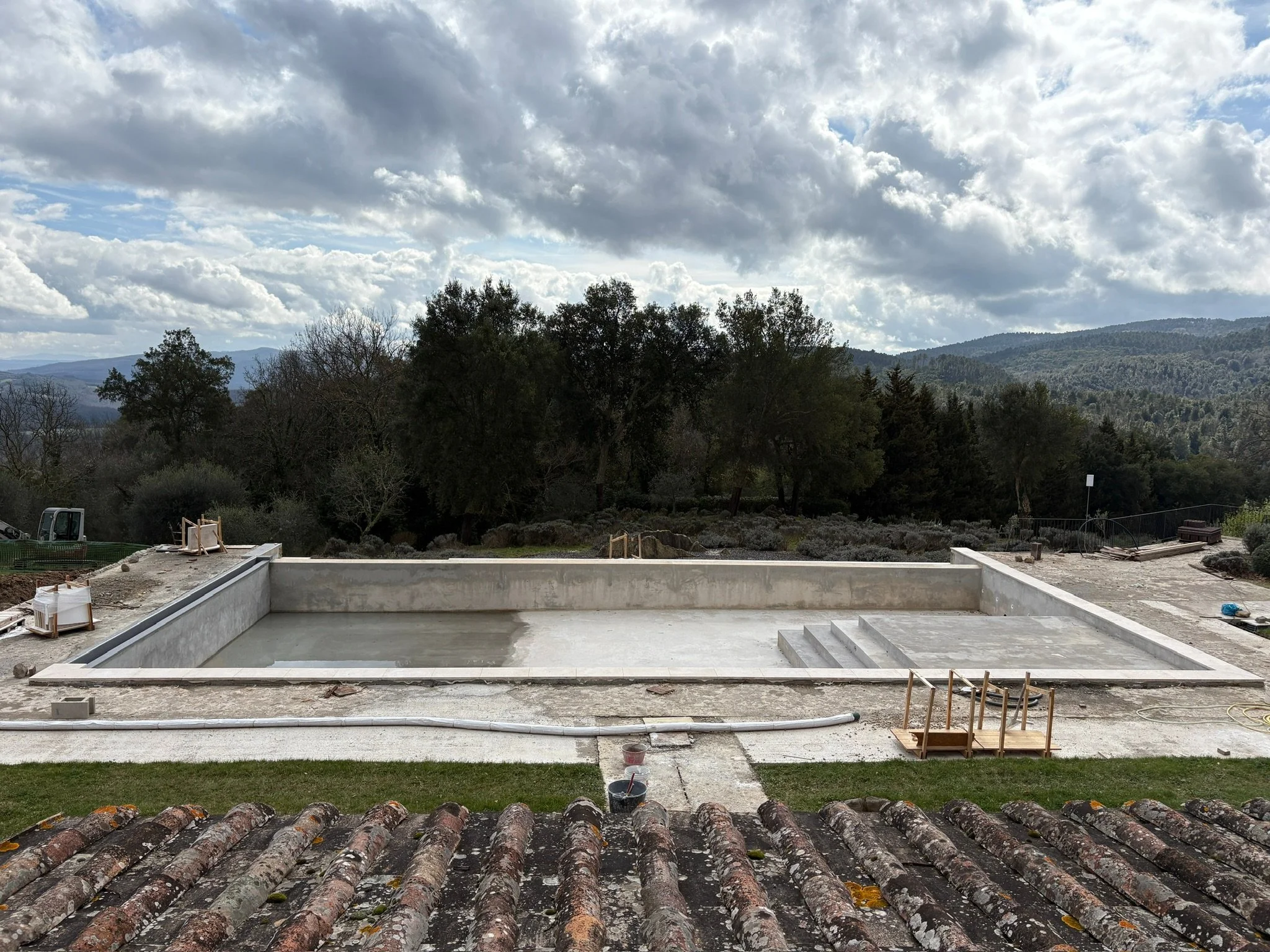 Laying the first of the travertine around the pool. Our pool builder, Spinelli, measured the height and installed the first layer in order to create the level for the rest of the deck, which will be laid in the coming days.