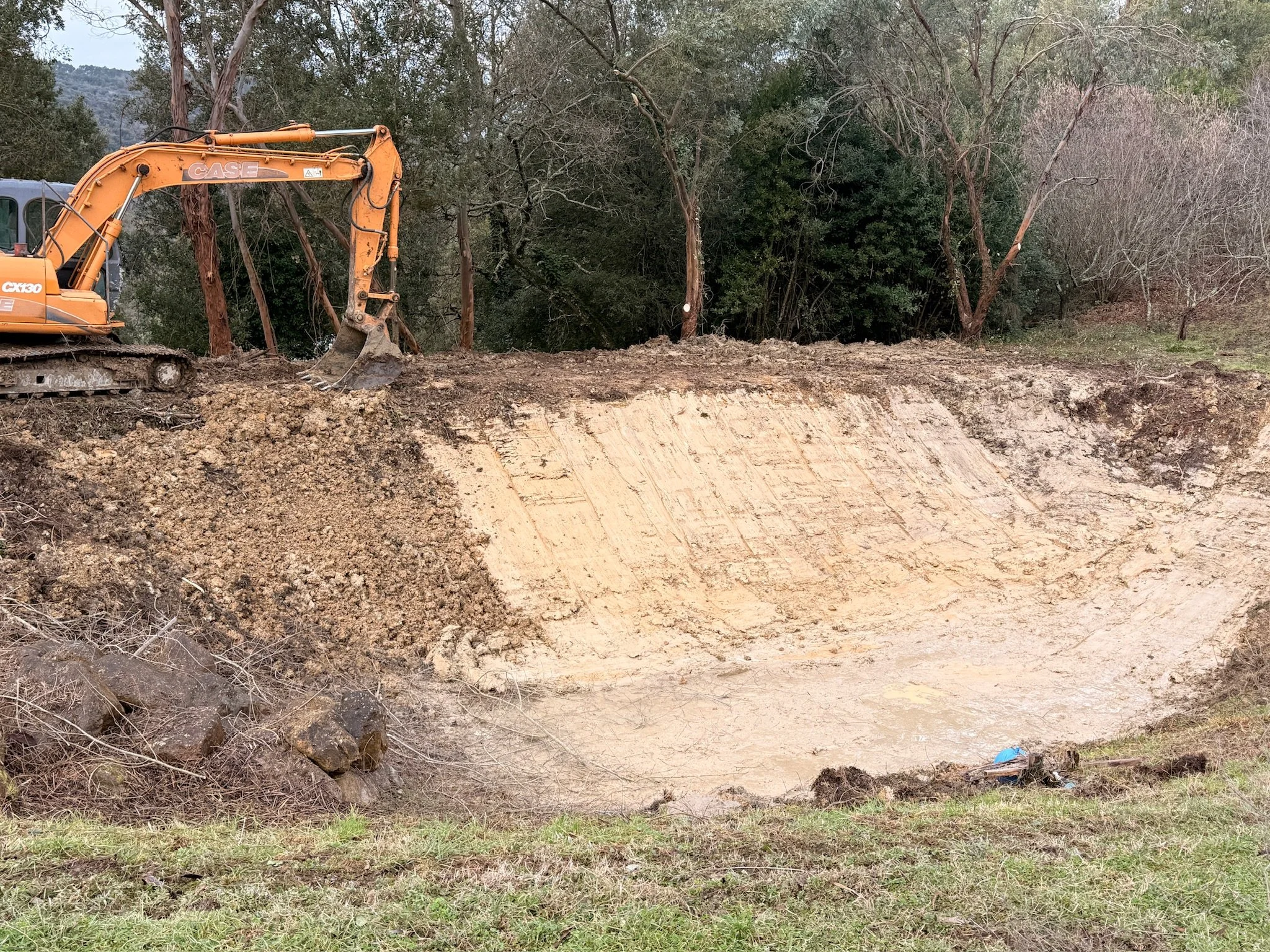 Digging out the natural pond that will be home to wildlife and stabilize the water table in our orchard.