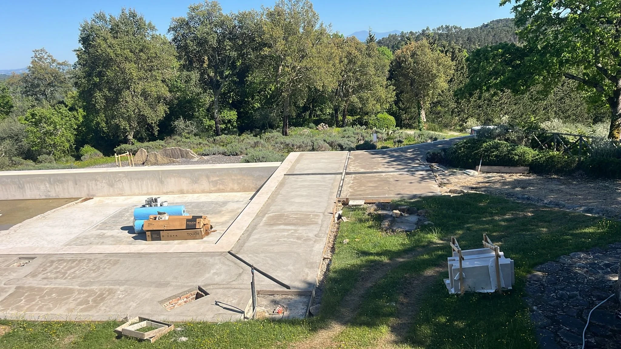 Of course, while we waited for our permits to renovate the interior of the villa, the pool renovation continued on with delivery of the new travertine tiles that will be used to expand the patio around the pool. Last week, they poured the concrete slab that the tiles will be installed on, along with new drains and access hatches. The liner is scheduled to be installed May 4th.