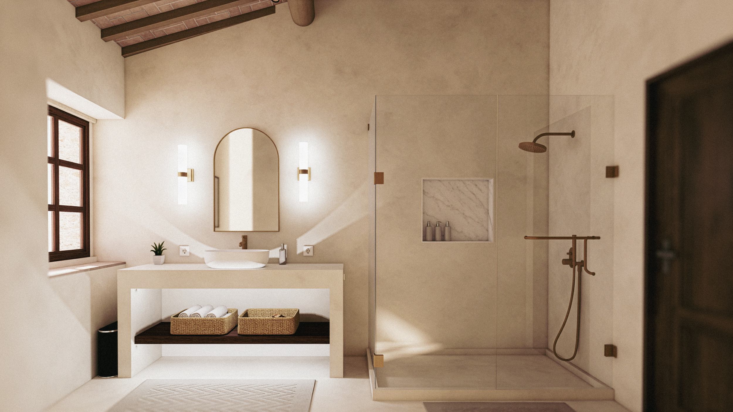 Guest bathrooms are being fully renovated with microcement floors and vanities, glass showers, new electrical, lighting, paint and new doors.